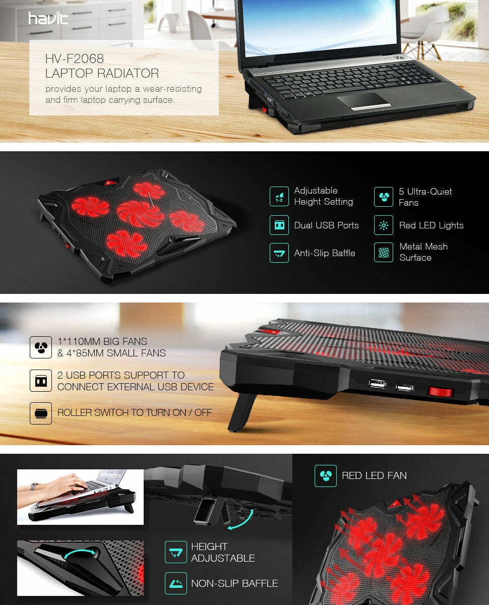 The 5 Quiet fans of HAVIT HV-F2068 5-Fan Laptop Cooler create a noise-free & interference-free environment for you. Provides total 65 CFM of air flow to draws heat away from your laptop.